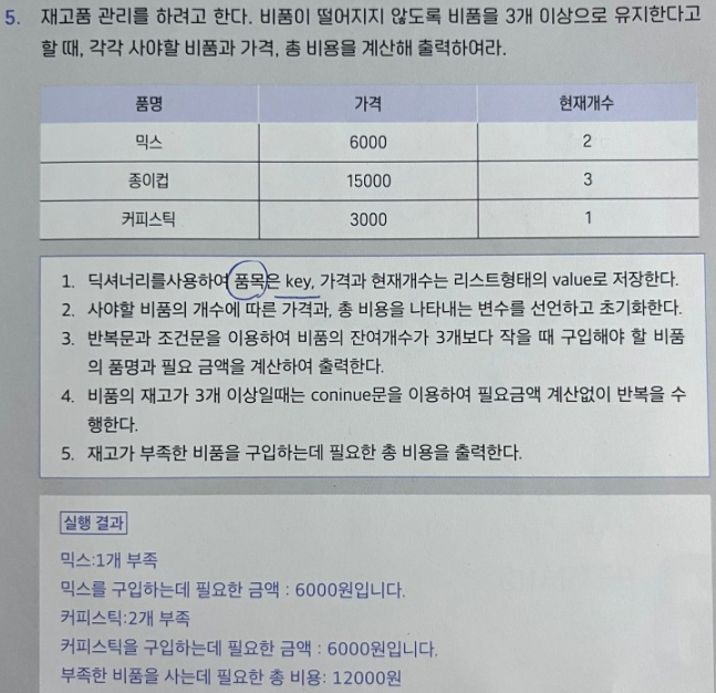product = {'믹스':[6000, 2], '종이컵':[15000, 3], '커피스틱':[3000, 1]} # 1) 품목 Key, 가격과 현재개수를 value