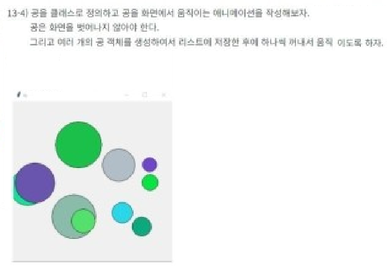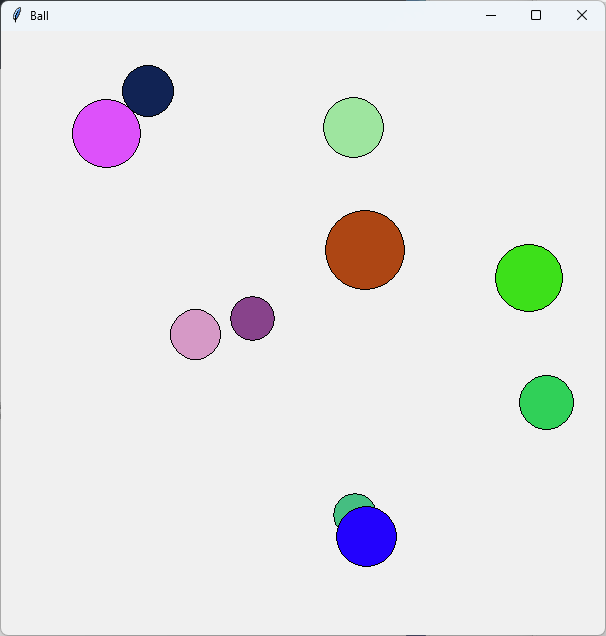 balls = [Ball(canvas, random_color(), random.randint(50,100)) for _ in range(10)] # 10개의 MovingBall 객체를 생성
