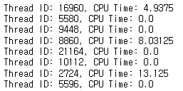 print(f"Thread ID: {thread.id}, CPU Time: {thread.user_time + thread.system_time}")