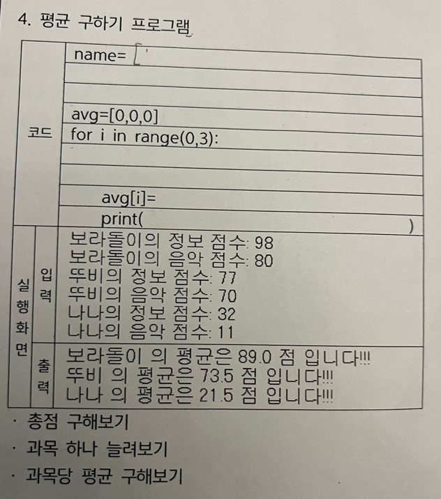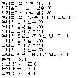 print(f"{subject[i]} 평균 : {subject_total[i]/len(subject)}")