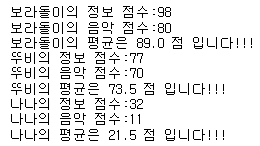 print(name[i] + '의 평균은',avg[i],'점 입니다!!!')