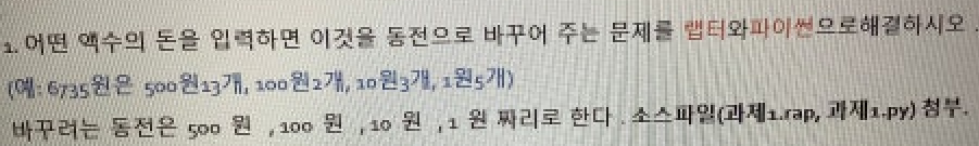 result_dic = {} # 동전의 수를 가지는 결과 딕셔너리. {'500':1, '100':2..} 와 같은 구조