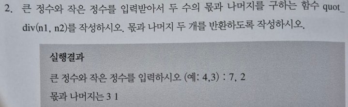 result = quot_div(a, b) # 함수 실행하여 결과르 받음. 결과는 튜플타입