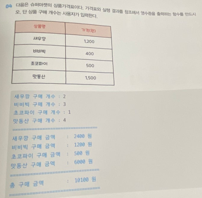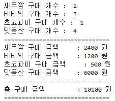 print(f"총 구매 금액 : {total} 원") # 총 판매 합계 출력