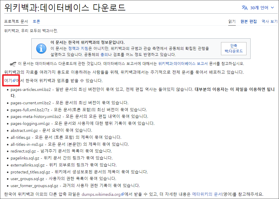 위키백과:데이터베이스 다운로드 - 위키백과, 우리 모두의 백과사전 (wikipedia.org)