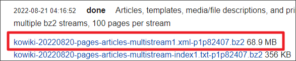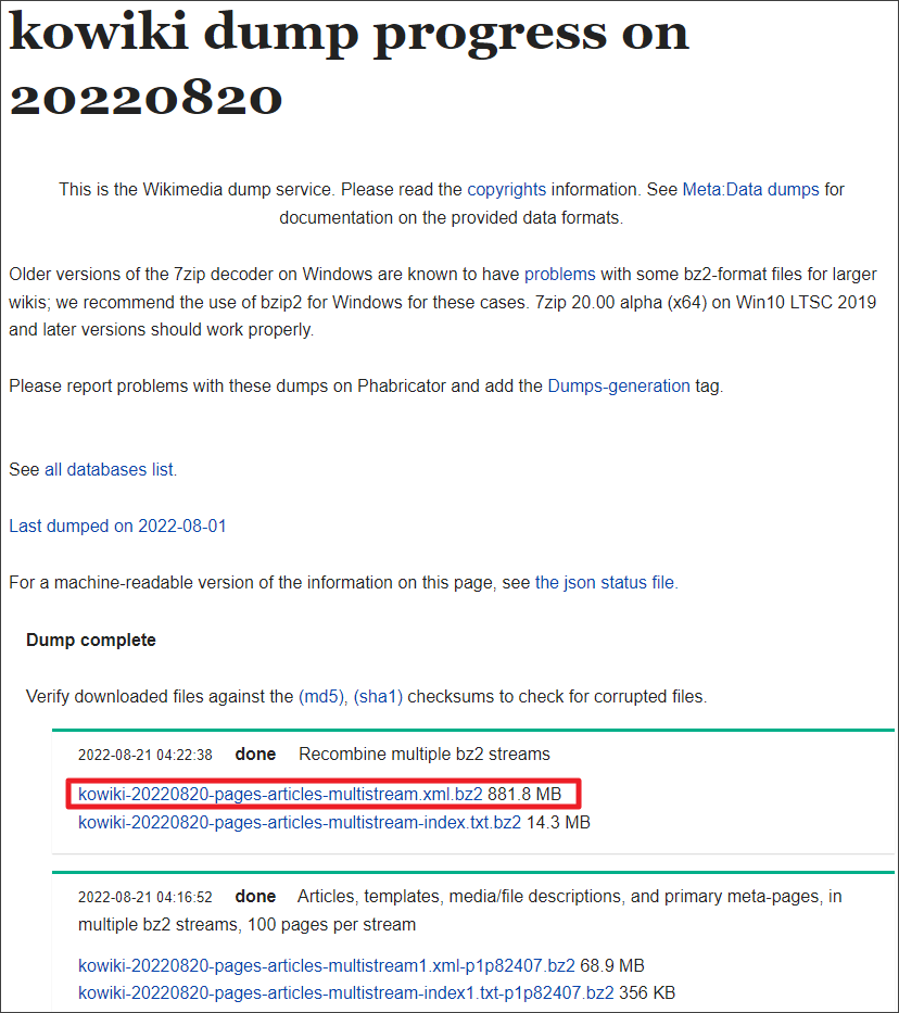 kowiki dump progress on 20220820 This is the Wikimedia dump service. Please read the copyrights information. See Meta:Data dumps for documentation on the provided data formats. Older versions of the 7zip decoder on Windows are known to have problems with s