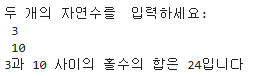 print(f"{a}과 {b} 사이의 홀수의 합은 {oddSum(a, b)}입니다") # 함수 실행 및 결과 출력