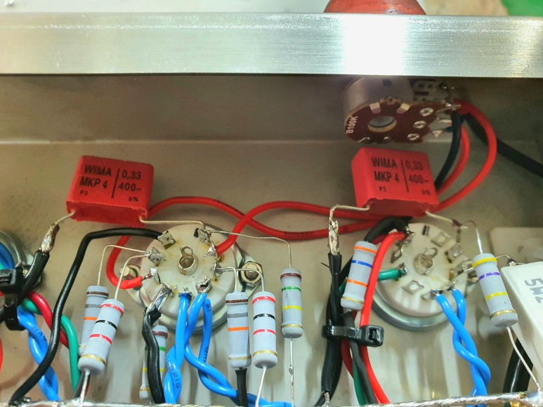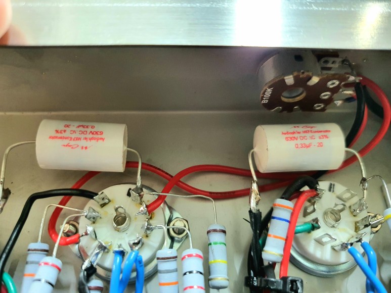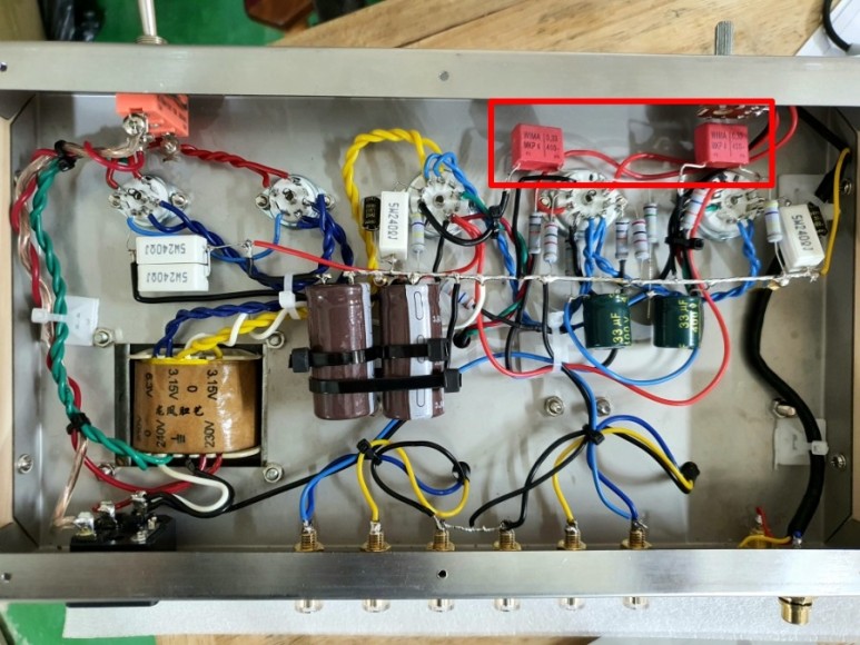 제작한 앰프 내부에서 커플링콘덴서 위치 입니다. 실제로는 좌,우 2개가 있습니다.