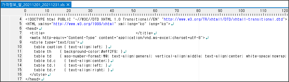파이썬에서 엑셀(xls) 파일을 읽기 중 다음과 같이 html 형태로 되어 있는 경우가 있습니다.
