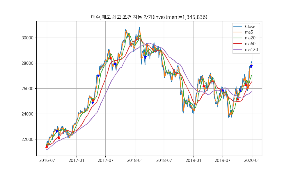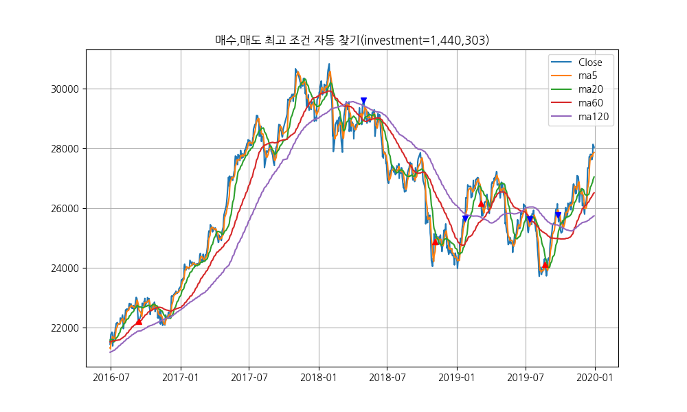 위 코드를 확장해서 매일, 과거의 최적 조건을 찾아서 투자를 해나가는 프로그램으로 확장해 보면 이윤이 나지는 않습니다.