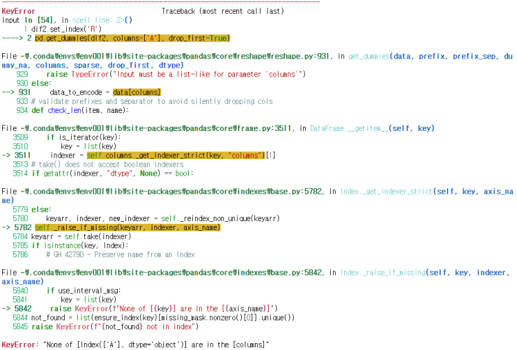 - 없는 column을 columns에 지정하려고 할 때 발생합니다. 위 코드에서 'A' column이 없는데 columns에 지정해서 에러가 발생했습니다.