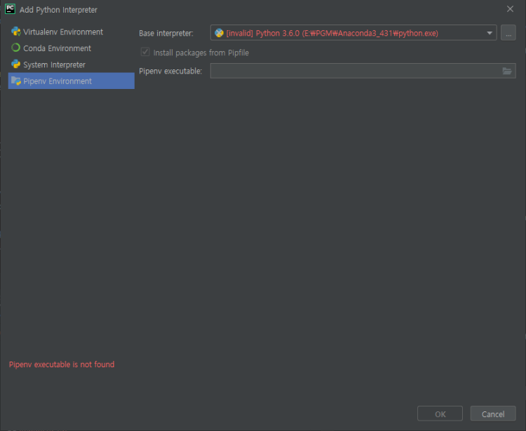 'Add Python interpreter' 화면에서 'Pipenv Environment'를 선택하고 오른쪽에서 파이썬을 지정하면 됩니다.