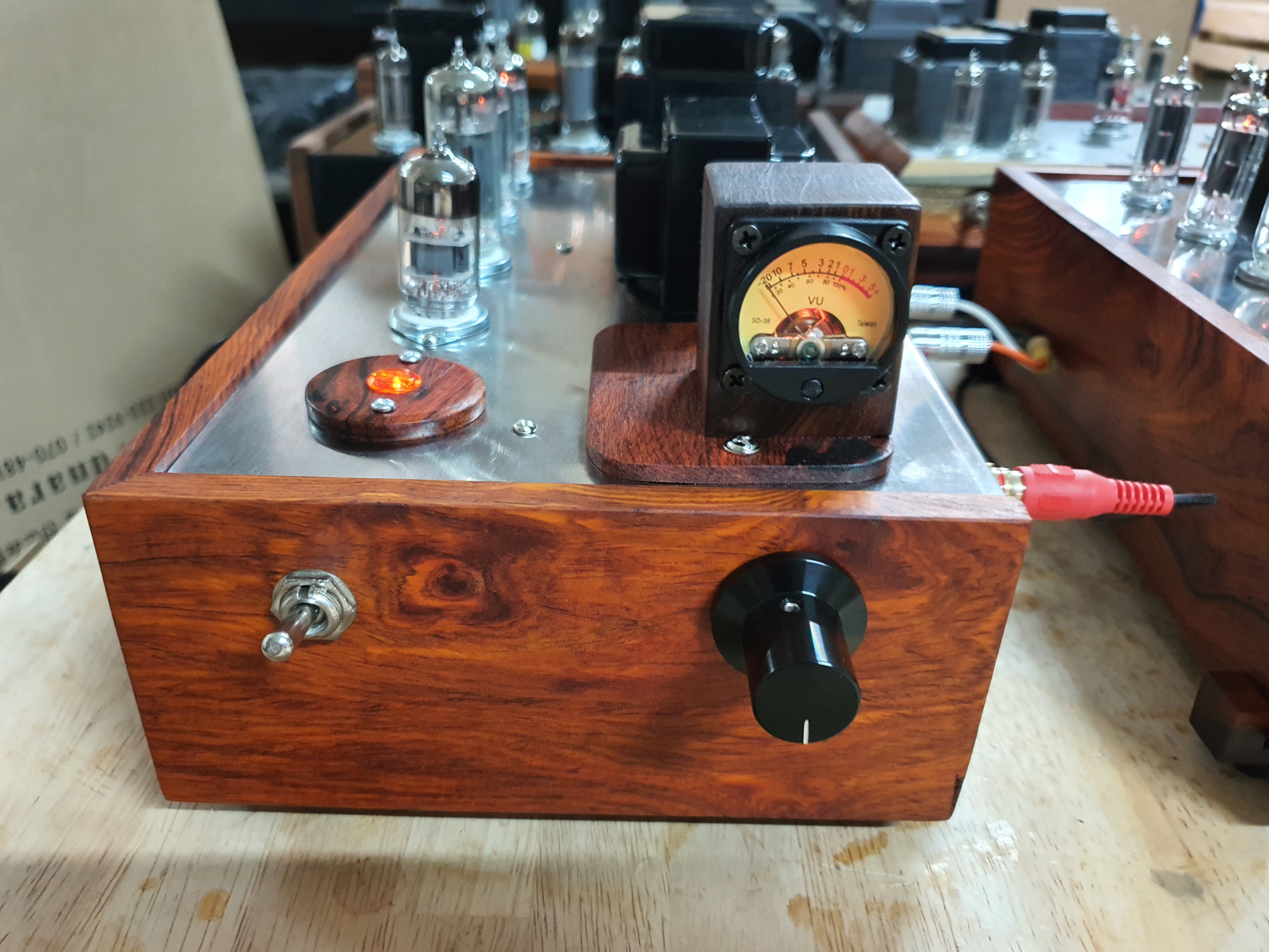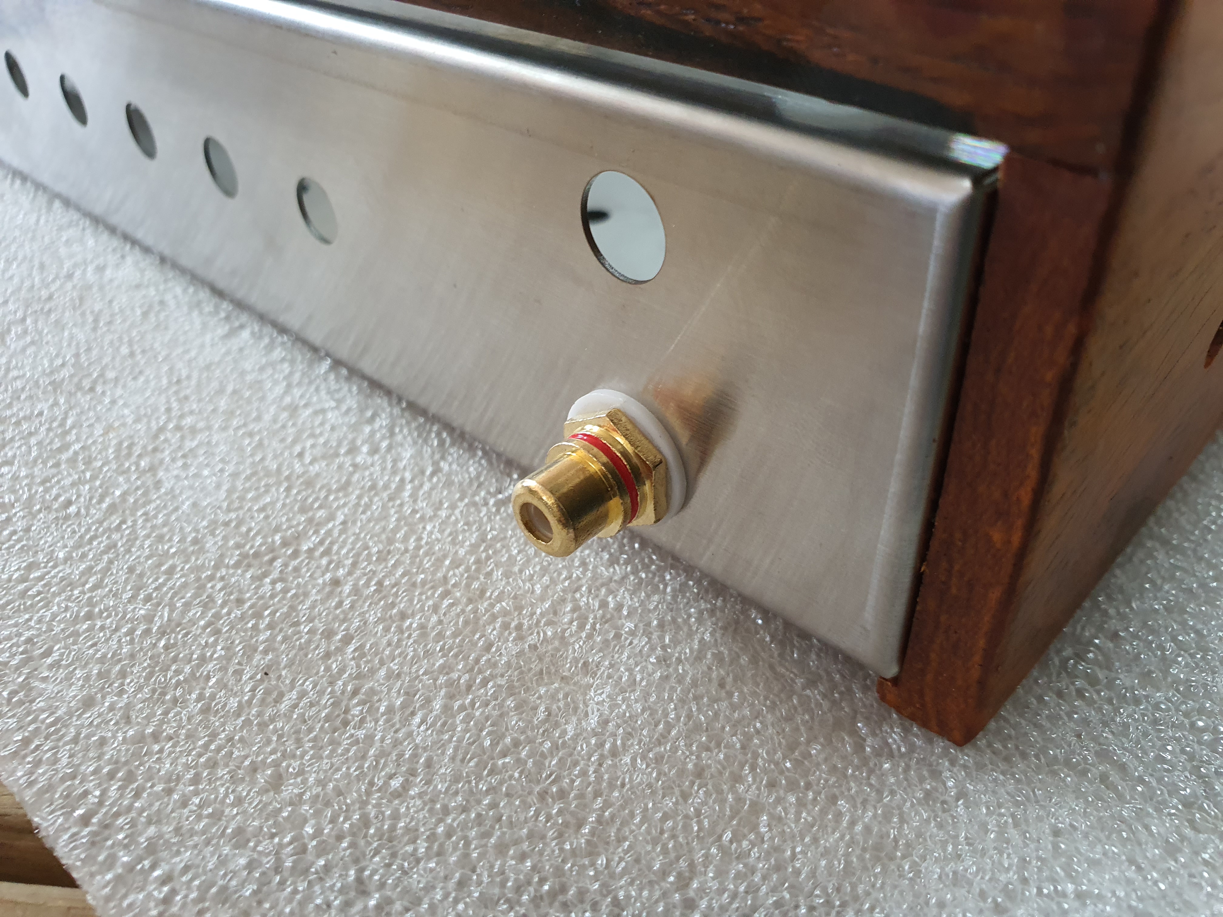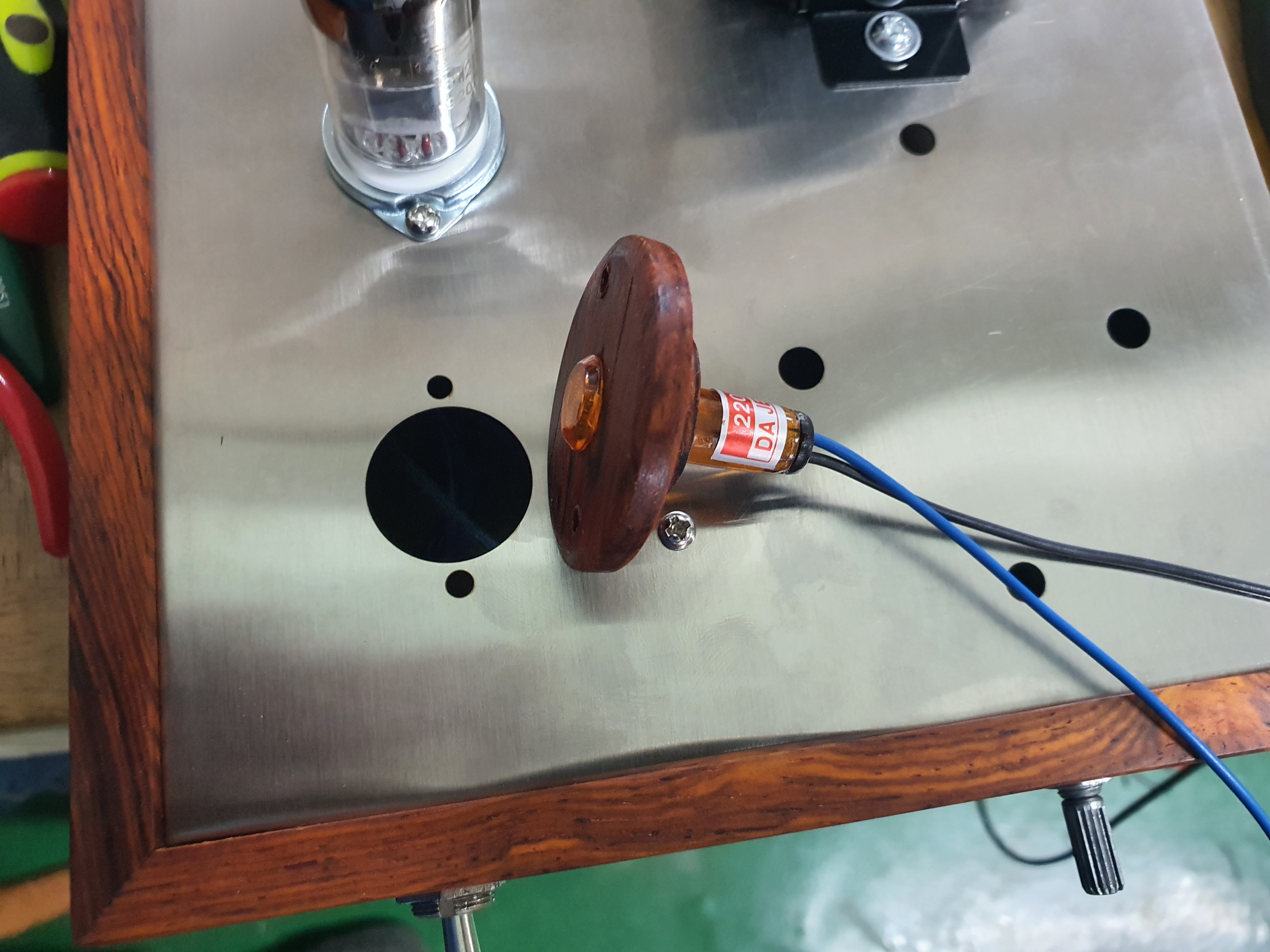 나무로 VU메타를 장착할 것으로 만들고 구멍을 뚫어서 아래에서 전원(AC) 및 출력선(AV)을 연결할 수 있도록 했습니다.