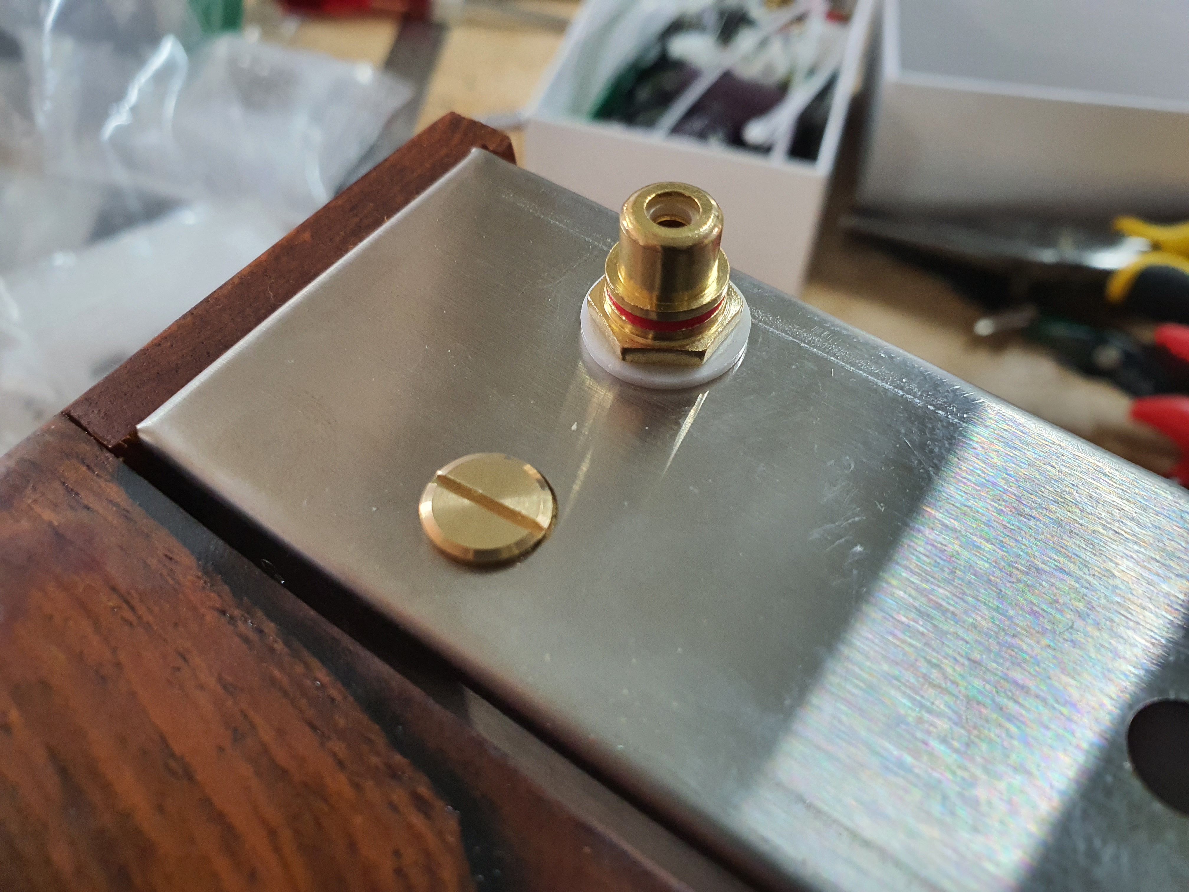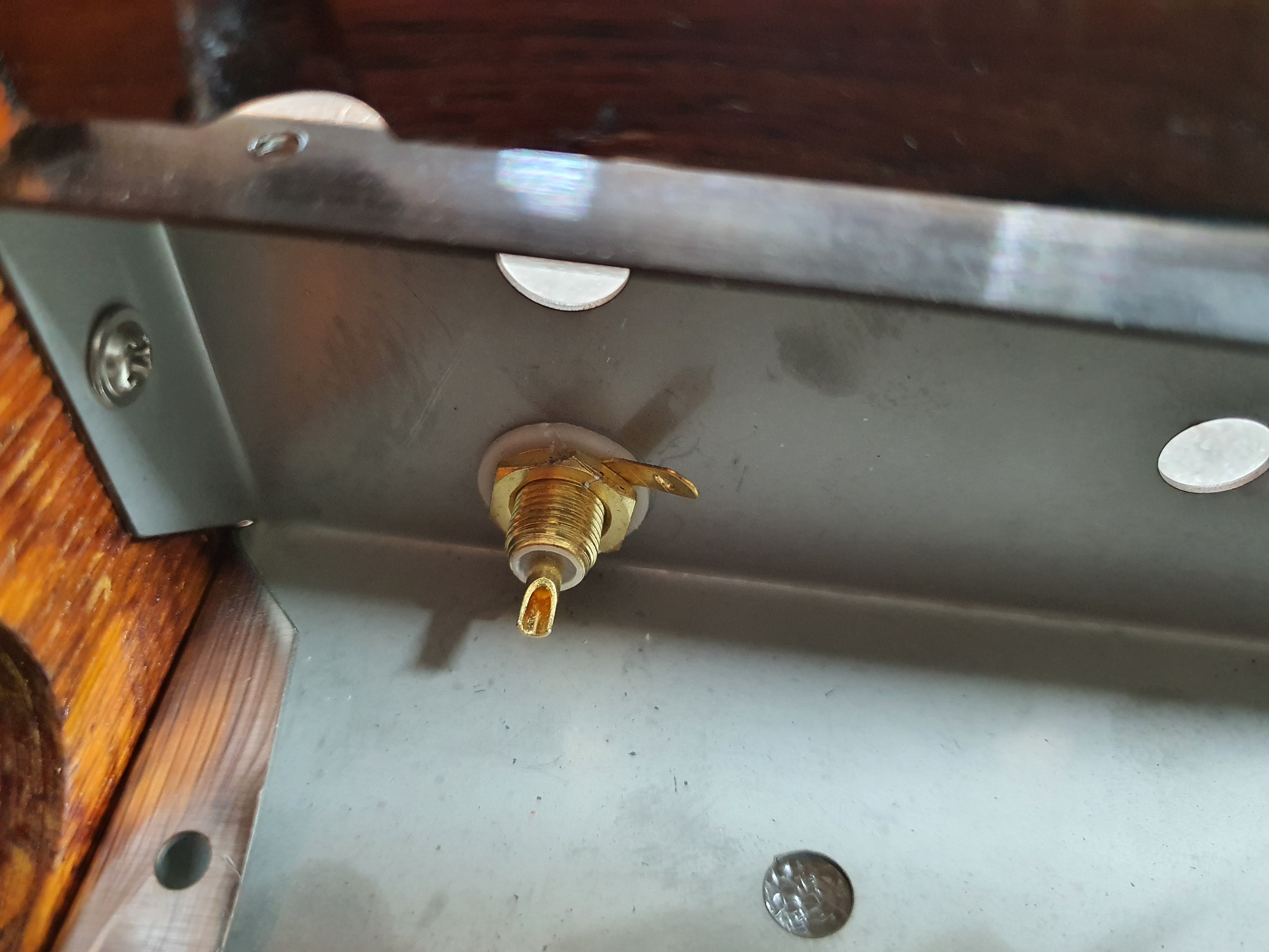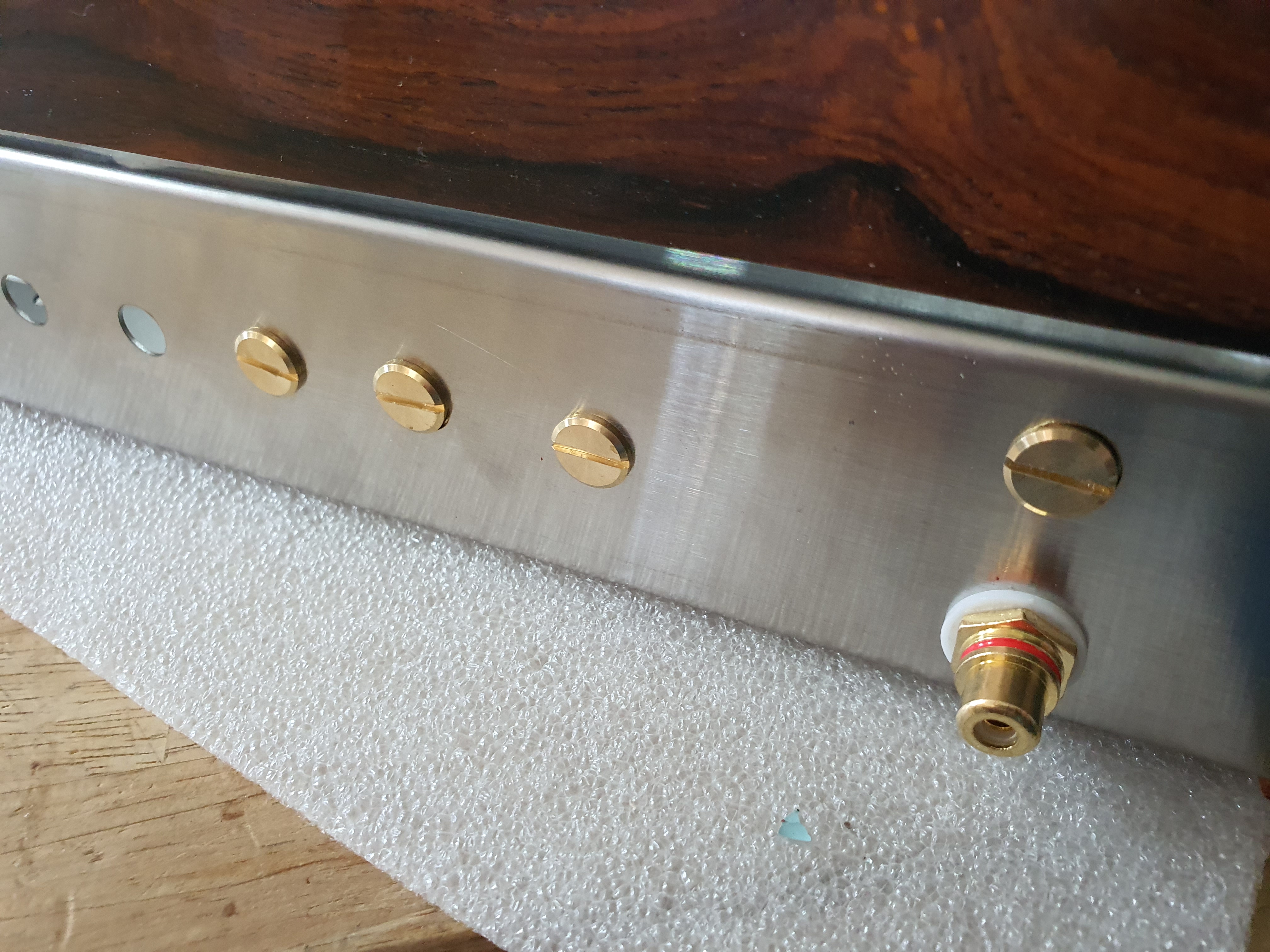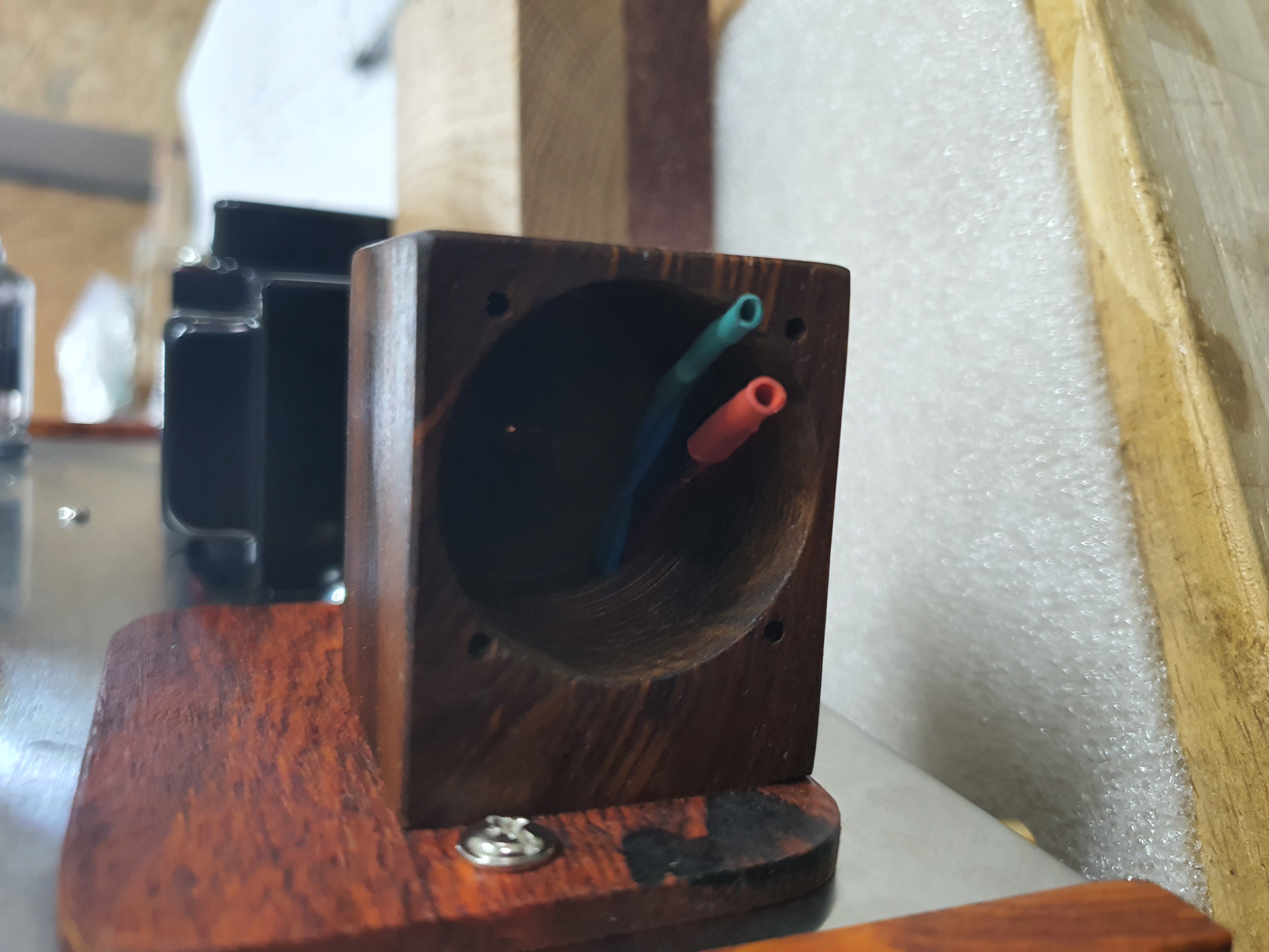 나무로 VU메타를 장착할 것으로 만들고 구멍을 뚫어서 아래에서 전원(AC) 및 출력선(AV)을 연결할 수 있도록 했습니다.