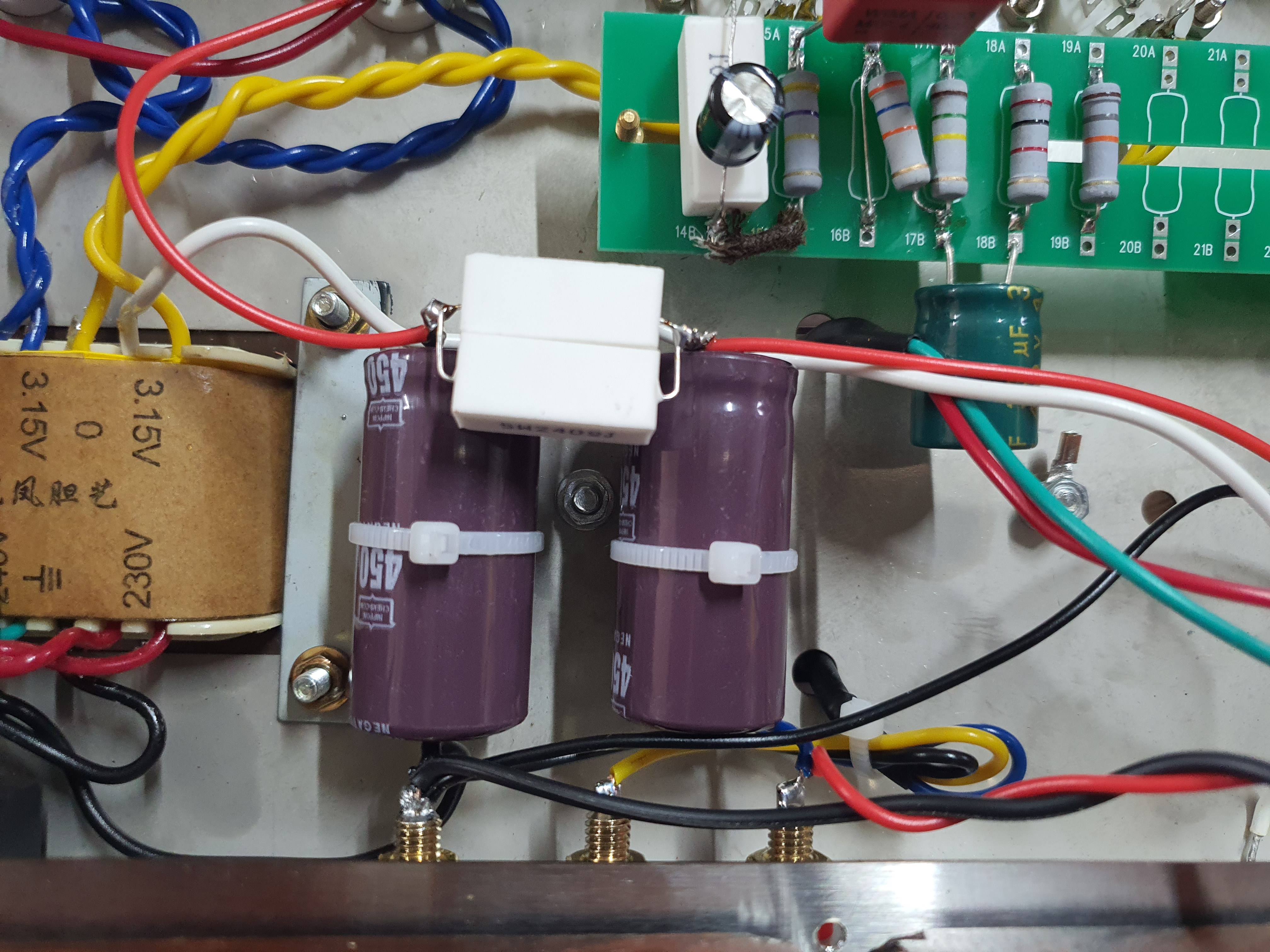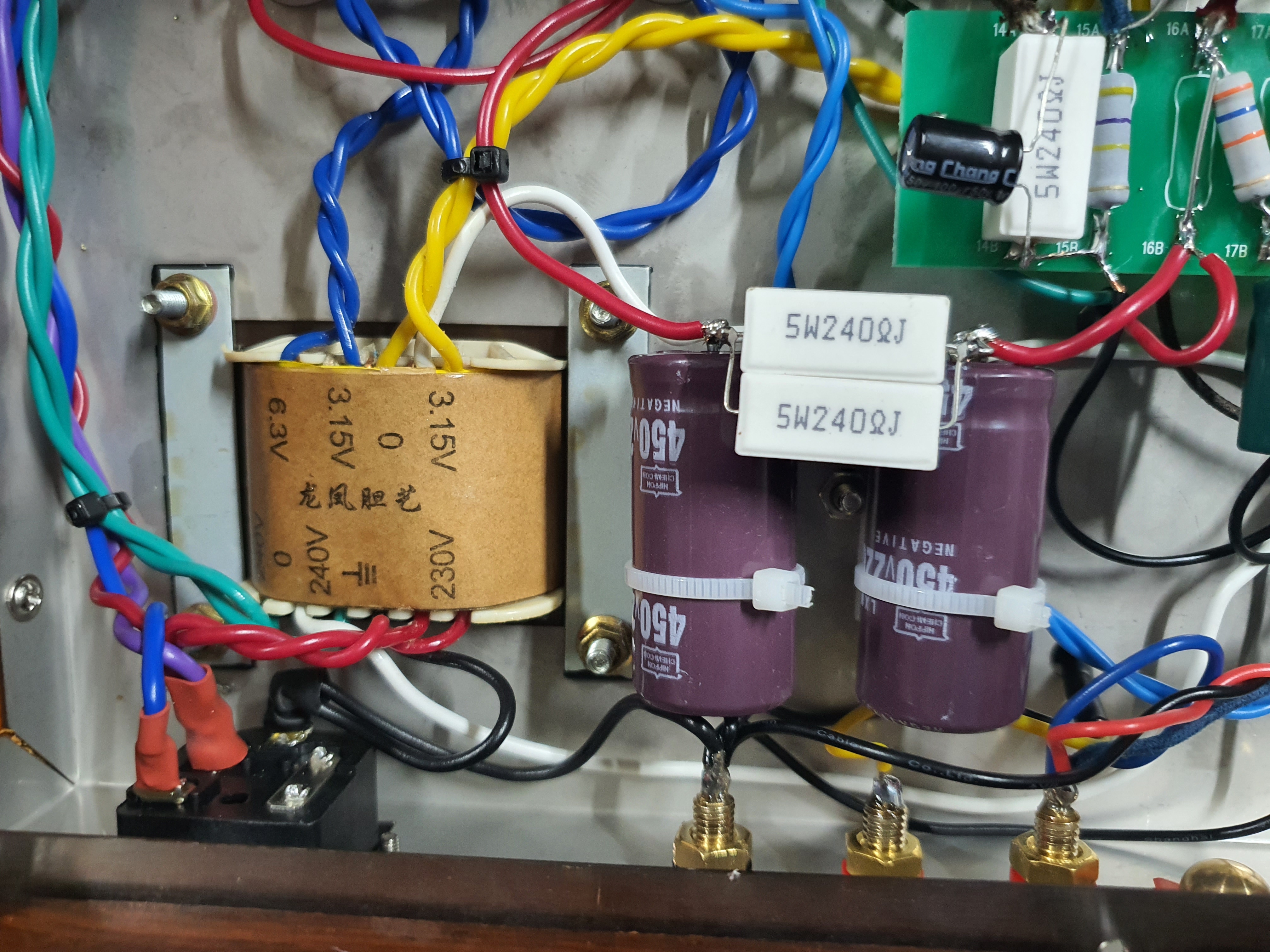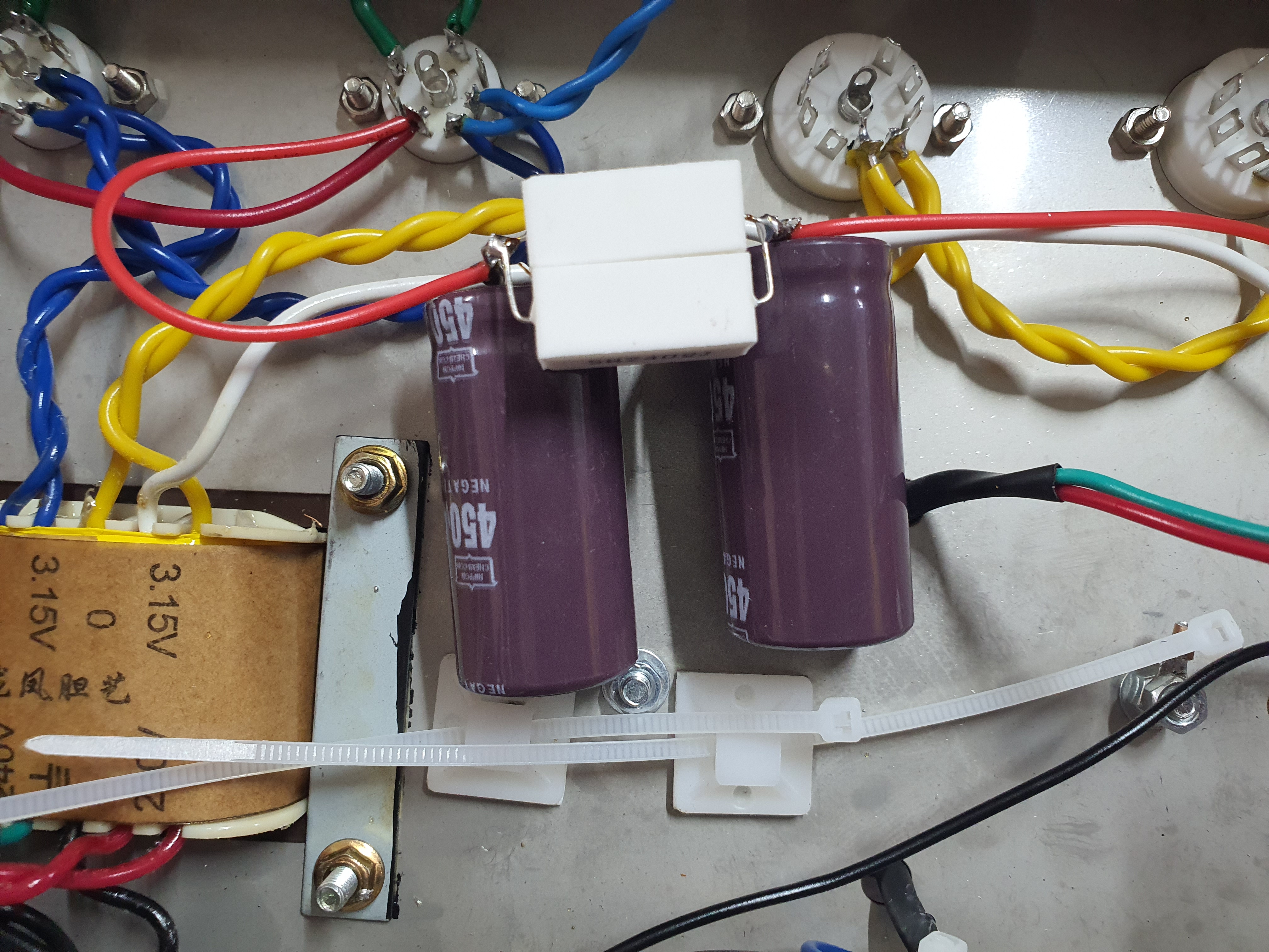 정류회로의 콘덴서와 저항은 미리 만들어 두어 이렇게 연결합니다. 부품 무게가 있기 때문에 케이블타이로 케이스에 부착합니다.