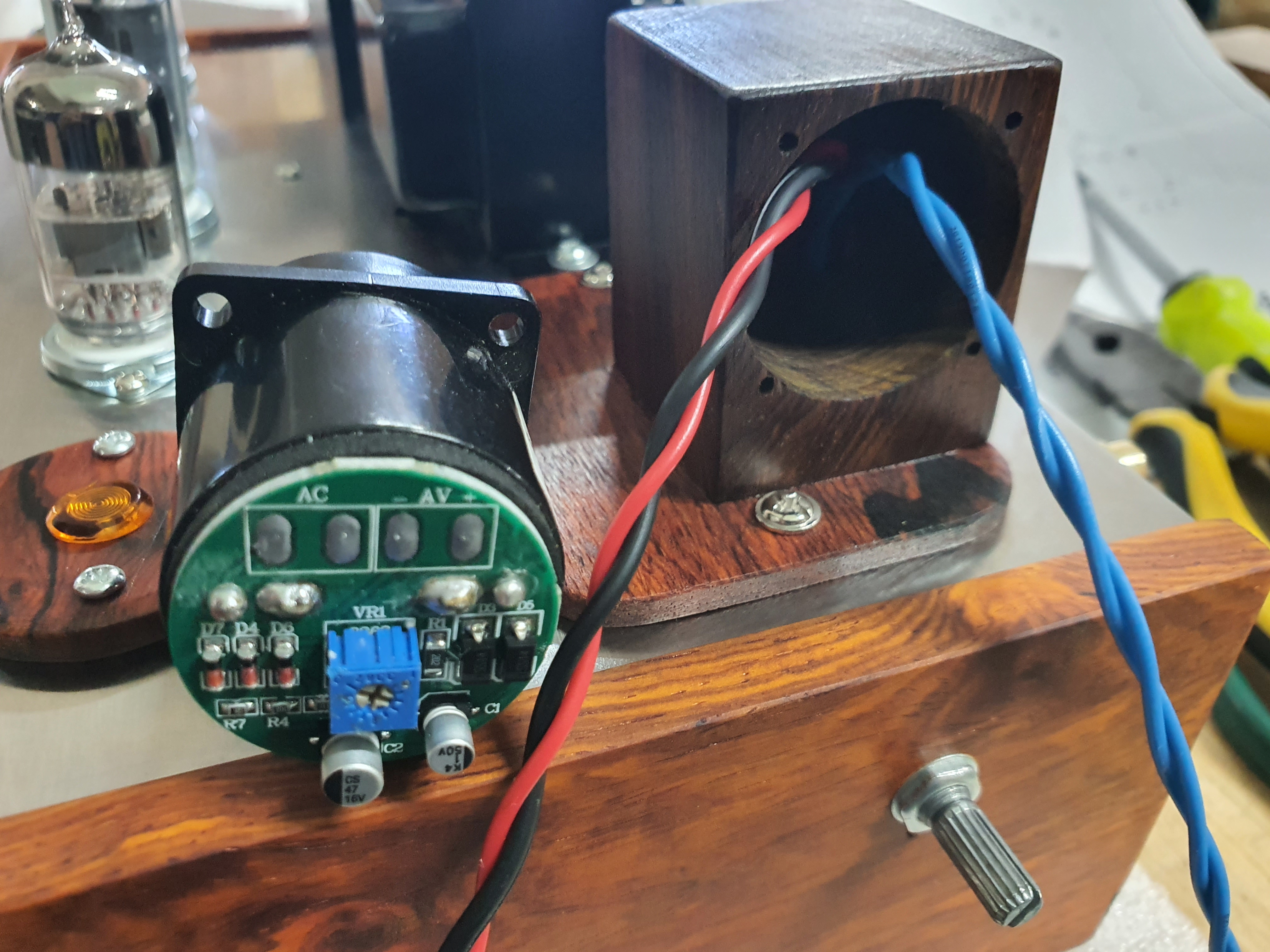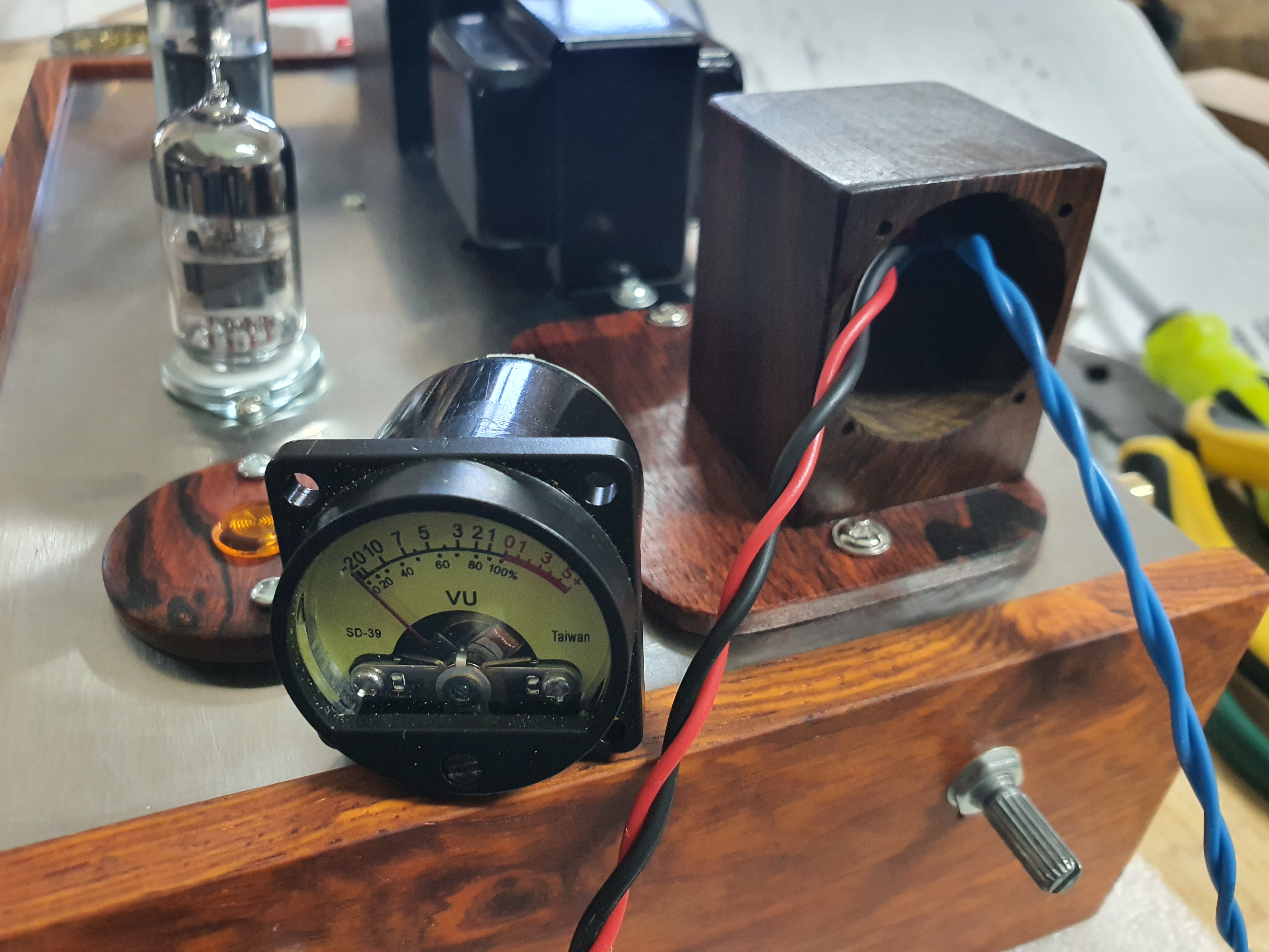 진공관앰프를 다 조립하고 음악을 틀어서 VU메타의 바늘이 움직이는 것으로 보면서 가변저항을 조정합니다.