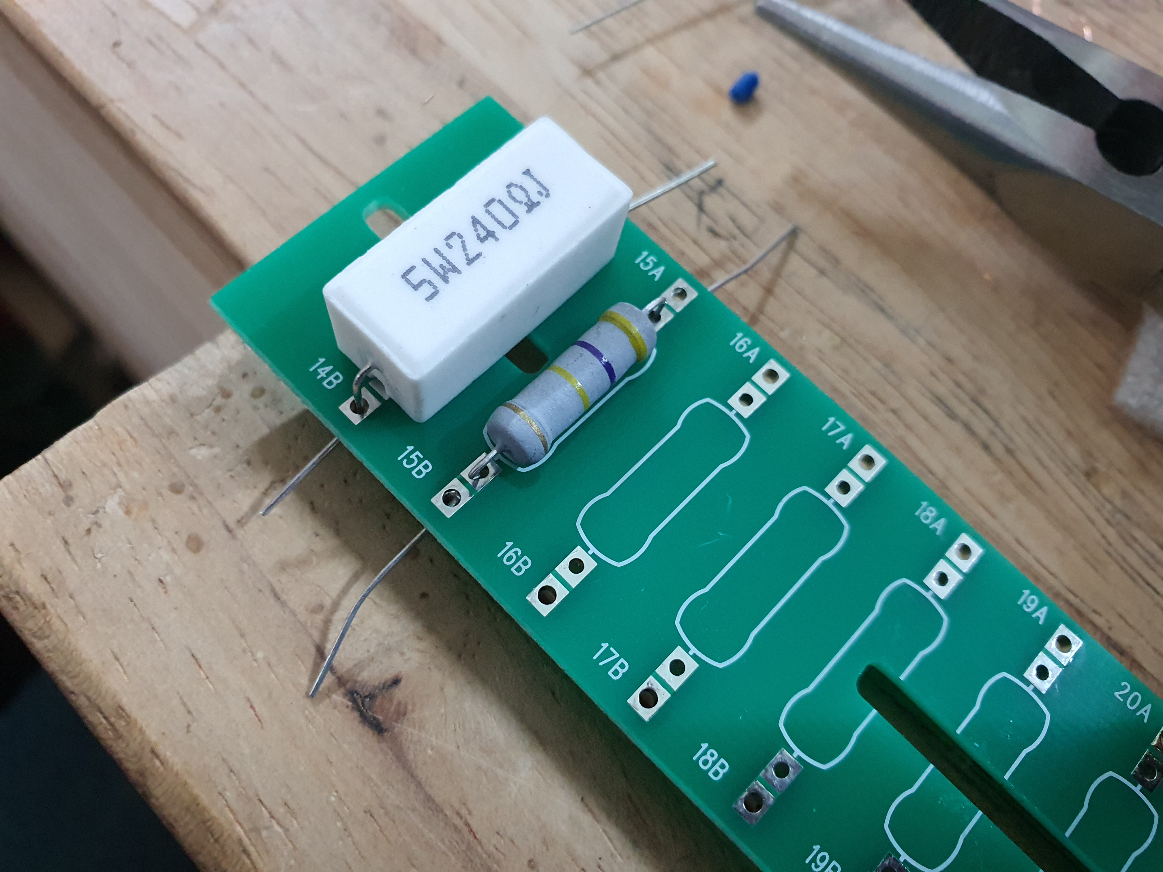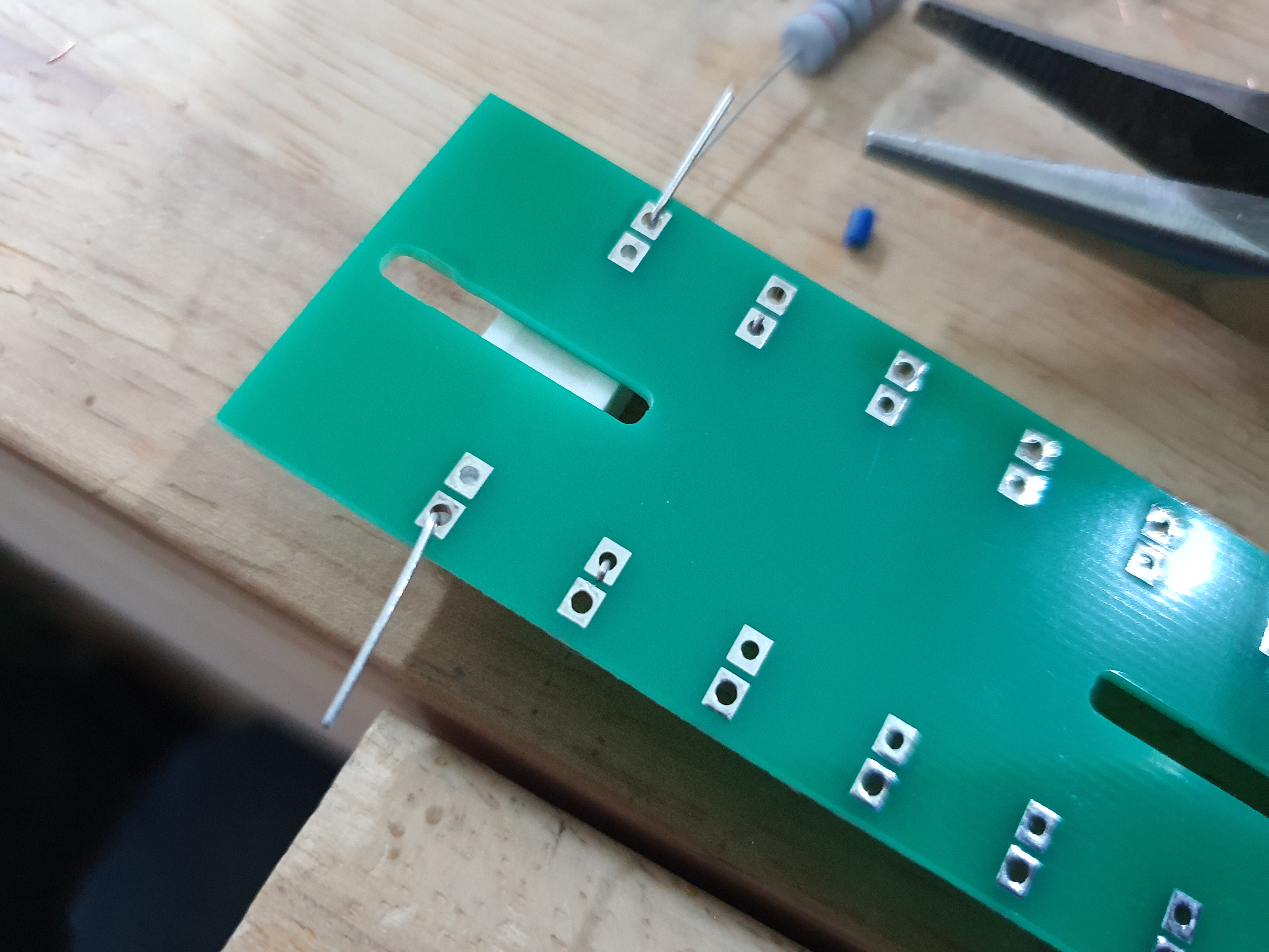 이런 PCB판에 전자부품을 쉽게 연결하는 방법 중 하나는 사진과 같이 부품을 끼우고 나온 리드선을 벌립니다.
