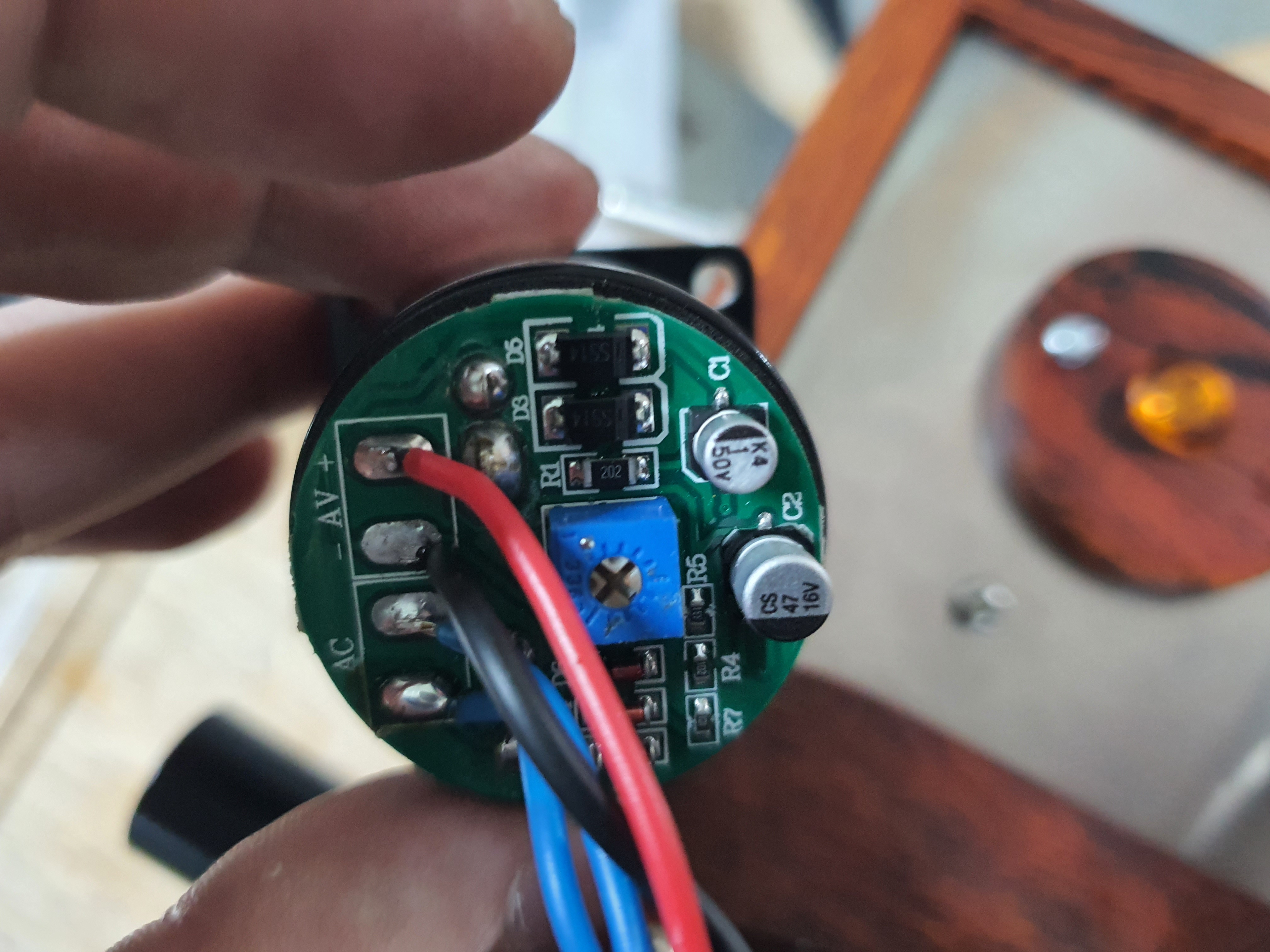 그래서 전원 네온램프를 사용하기로 했습니다. 네온램프의 부착 둘레가 10mm 이어서 나무로 미로 부착물을 만들어 두었습니다.