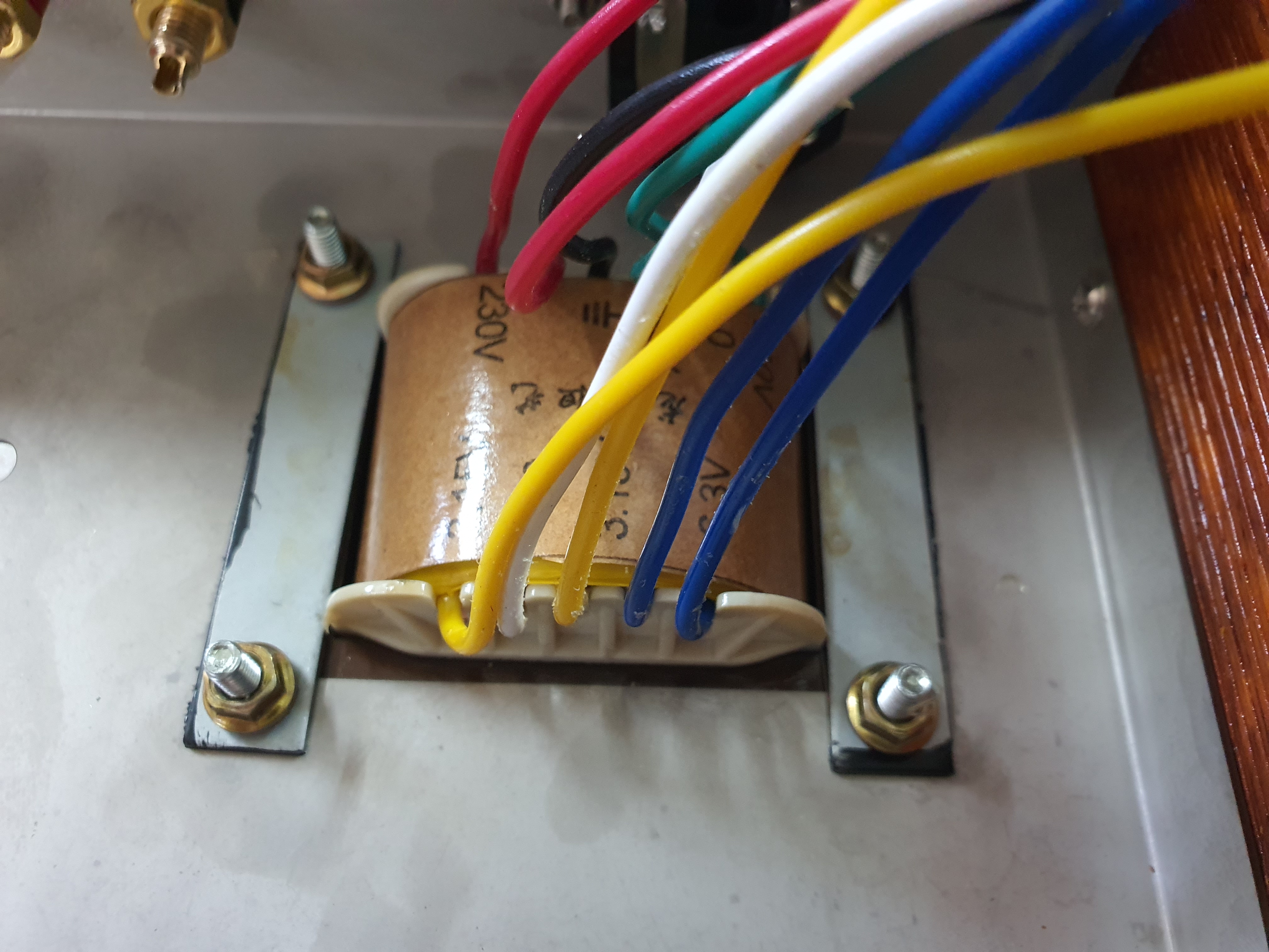 케이스에 체결합니다. 이때 트랜스의 방향을 어떻게 하는 게 좋은지 고민하게 되는데, 저는 사진과 같이 230V, 240V 부위가 위쪽으로 즉 전원소켓 쪽으로 가도록 하는게 좋은 것 같습니다.