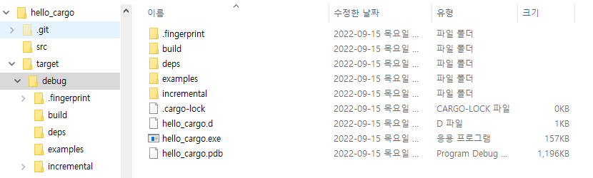 taget/debug 폴더 내에 실행파일인 hello_cargo.exe 파일이 만들어진 것을 확인 할 수 있습니다.