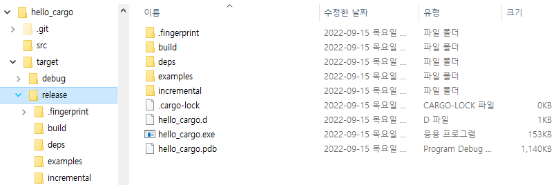 debug 폴더 내의 hello_carg.exe 파일과 release폴더 내의 hello_cargo.exe 파일의 용량이 다른 것을 확인할 수 있습니다.