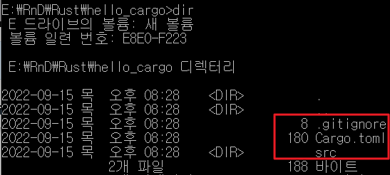 hello_cargo 폴더로 이동해서 dir로 만들어진 파일 및 폴더를 확인해 보겠습니다.