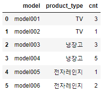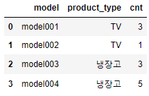 df.columns = ['model','product_type','cnt'] # column명 지정