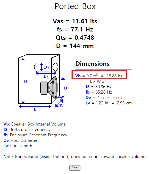 'Speaker Box Volume Calculator / Designer' 화면에서 위 값들을 입력해서 'Volume' 값을 맞추면 됩니다.