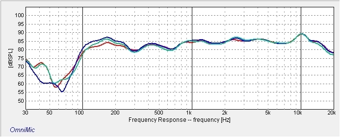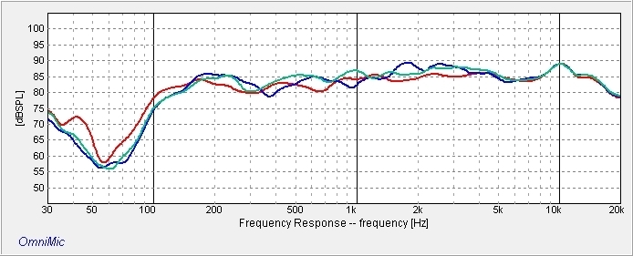 작은 크기(파란색)의 경우 저음도 낮고 중음부가 더 출렁이는 것으로 보입니다. 정사작형으로 만들어서 더 그럴 수도 있을 것 같습니다.