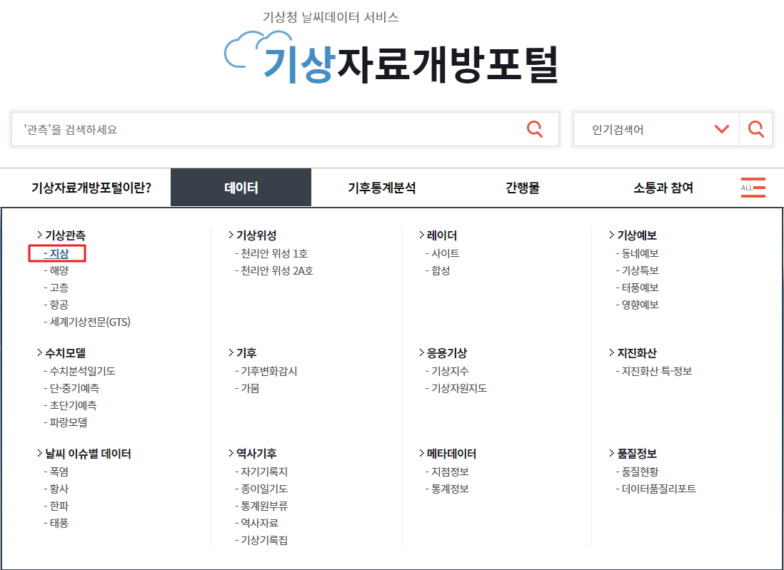 '데이터' 메뉴에서 '기상관측'/'지상'을 선택합니다.