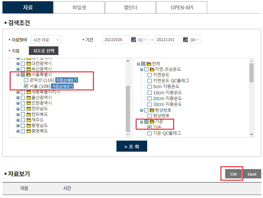 아래와 같은 옵션에서 기간, 도시, 항목(기온)을 선택하고, csv 파일로 받습니다.