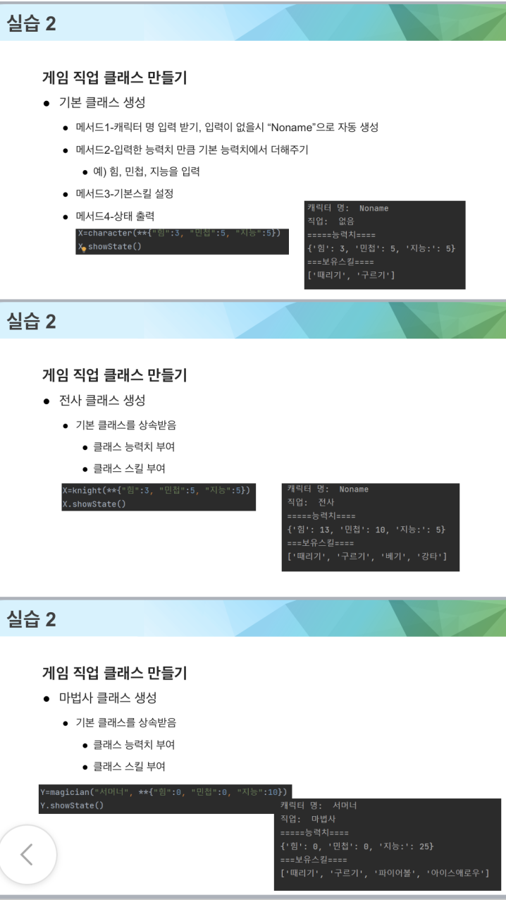 X = magician("서머너",**{"힘":0, "민첩":0, "지능":10}) # 바법사 클랙스 인스턴스 생성. 캐릭터명 입력되어 사용