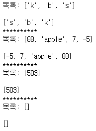 data = [['k','b','s'], [88,'apple',7,-5], [503], []] # 인자로 주어질 리스트을 담은 리스트