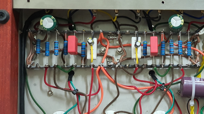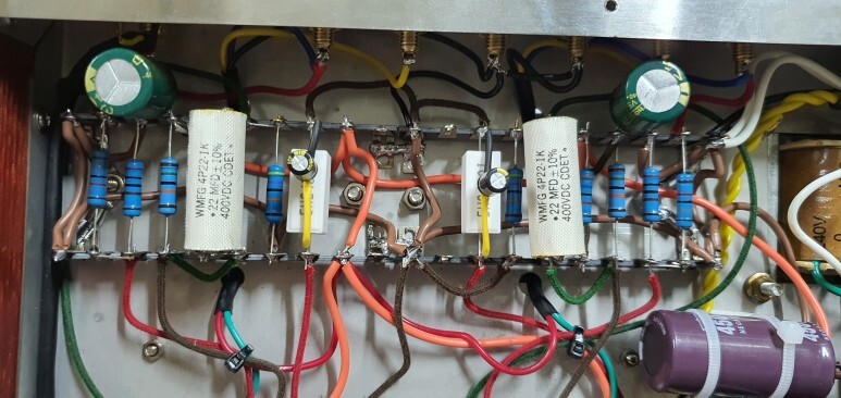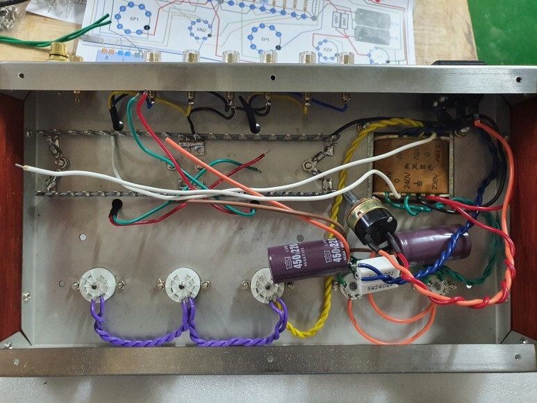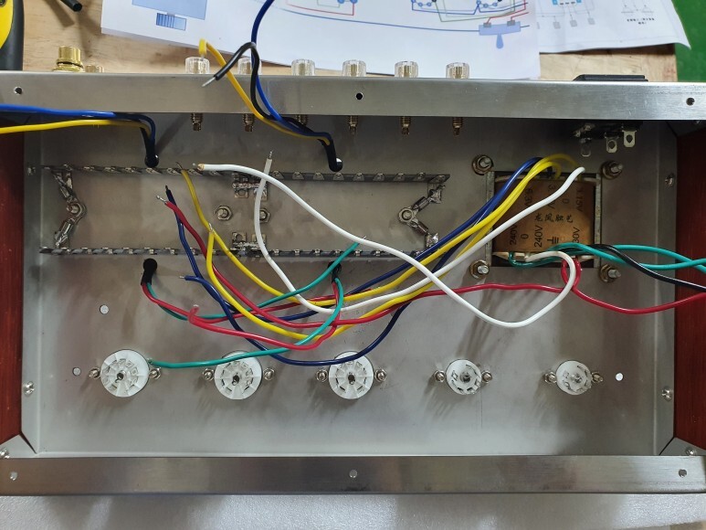 진공관 전원 배선 처리 합니다. 전원선들이 사진상 아래 방향으로 가도록 하기 위해서 6N2, 6P1의 소켓 방향으로 변경 했습니다.
