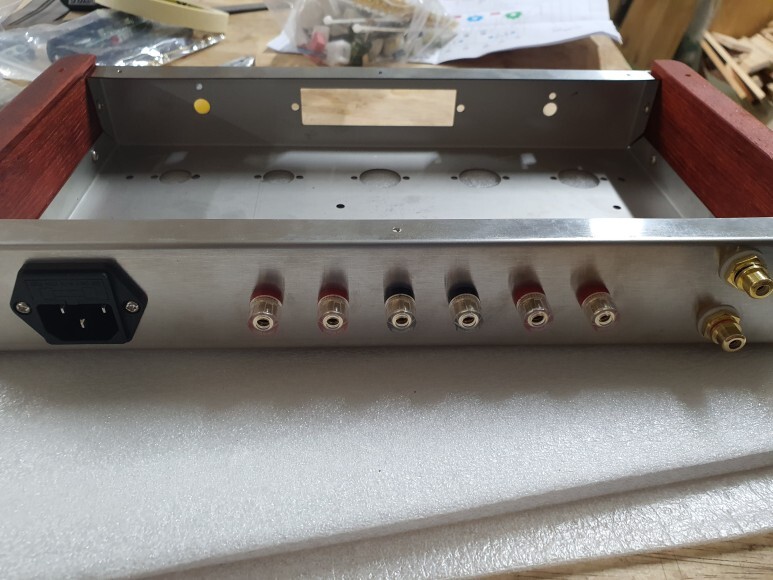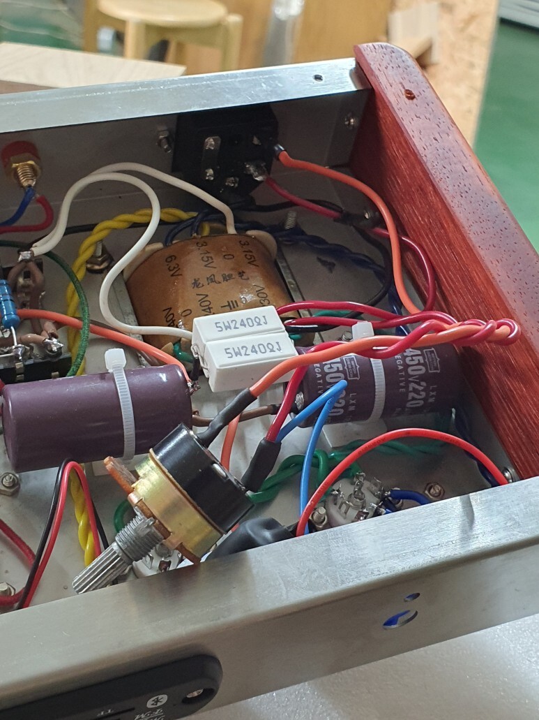 전원플러그까지 조립한 모습 입니다. 전원플러그는 나중에 작업하는게 좋겠습니다. 전원트랜스가 바로 옆에 있어서 배선 작업시 걸리적 거립니다. 못 하는 것은 아닙니다.