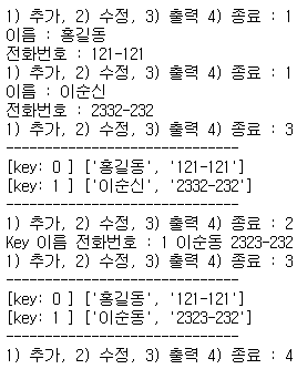 action = input('1) 추가, 2) 수정, 3) 출력 4) 종료 : ')