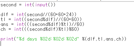 dlf = int(second//(60*60*24)) # int 하기 때문에 86400(60*60*24) 보다 커야만 1 이상이 나옵니다