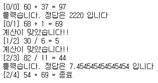 calcu = random.randint(1, 4) # 1=+, 2=-, 3=*, 4=/ (사칙연산 구분 난수 발생)