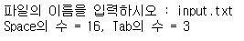 print(f"Space의 수 = {s_cnt}, Tab의 수 = {t_cnt}") # 출력