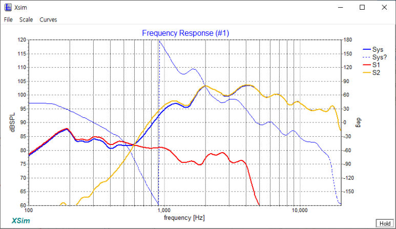 입니다. 특정 주파수가 음압이 높지 않도록 하는 것입니다. 스피커유닛만 추가했을때를 보면 고음(노랑) 주파수가 저음(빨강)보다 SPL이 높습니다. 그리고 저음(빨강)과 고음(노랑)이 겹치는 부분은 두 소기가 합해져서 SPL이 커져 있습니다. 저음의 주파수 끝은 낮추고 고음의 주파수 시작을 높여서 겹치는 부분을 조정하는 것입니다.