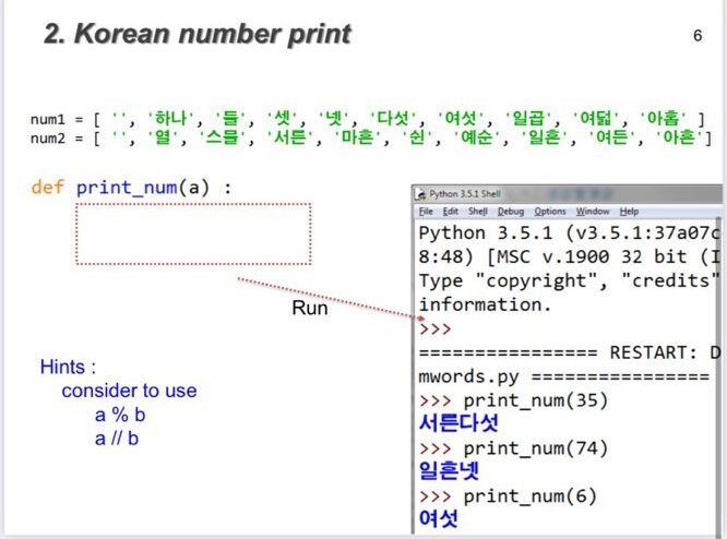 rtn += num1[a%10] # 일자리 구하기. % 연산자는 나누기의 나머지 입니다. a=25면 25%10 = 5가 됩니다. num1[5]='다삿'