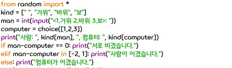 print("사람: ",kind[man], ", 컴퓨터: ",kind[computer]) # 사람 입력과 컴퓨터 선택을 출력