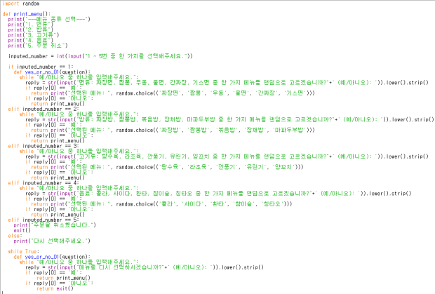 reply = input(title +" : " + ss + " 중 한 가리를 랜덤으로 (예/아니오): ").strip() #