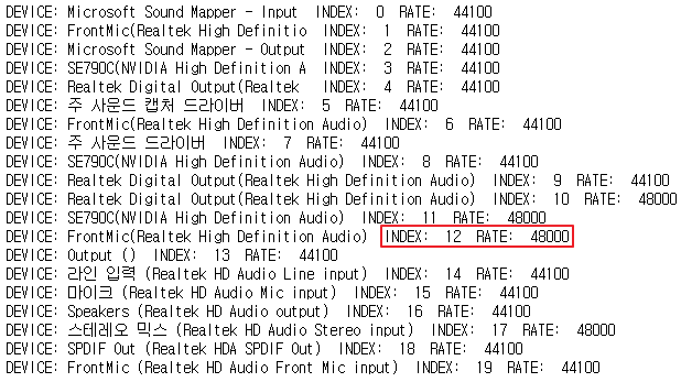 마이크 인덱스 번호 확인., 아래 결과에서 INDEX=12, RATE=48000을 확인