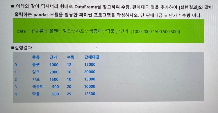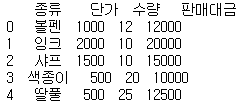 data = {"종류":["볼펜","잉크","샤프","색종이","딸풀"],"단가":[1000,2000,1500,500,500]}