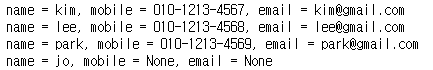print(f"name = {k}, mobile = {d[0]}, email = {d[1]}") # 출력