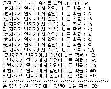 동전 던지기 시도 횟수를 입력 (1~100) :52