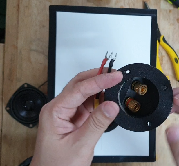 스피커 유닛에 전선을 연결해서 뒤쪽의 바나나플러그에 연결합니다.