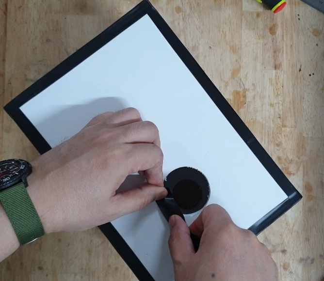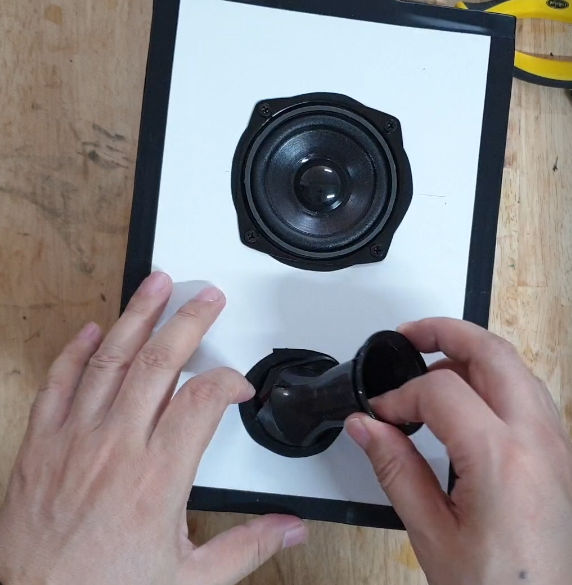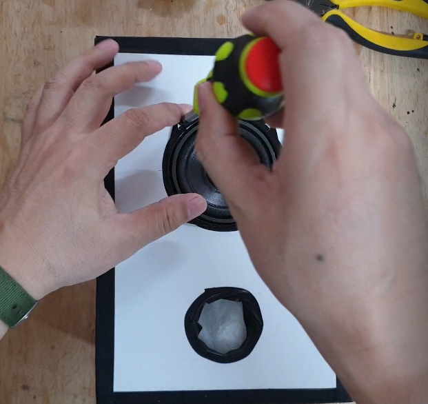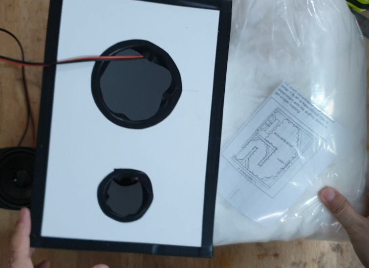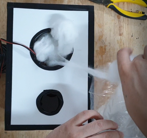 스피커 유닛 조립 전에 스피커용 솜을 채워 줍니다.