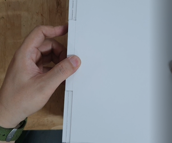 아래 사진애서 왼쪽은 폼보드로 만든 후 시트지를 붙여본 것이고 오른쪽은 테이프로 마무리한 것입니다.